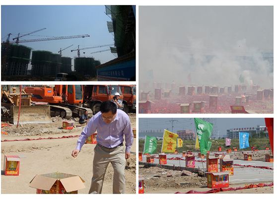 彩旗招展的现场,一排排挖掘机气宇轩昂地排列着,十余部推土机、运土车轰鸣待命,不远处高耸着十几栋正在结构施工的单体,塔吊回旋,泵车激荡,给这个仪式现场又营造了更热烈的氛围。上午9:58时许,在一派喜庆和激动的气氛之中,安徽华盛发展集团总经理王昆先生亲自点燃了礼炮,随后现场礼花、鞭炮齐鸣,震天动地,一瞬间天空中姹紫嫣红、绚丽夺目,一派壮观热烈的场面。